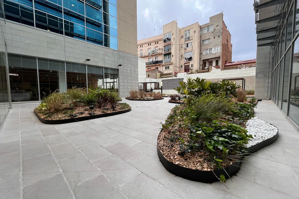La intervenció, realitzada durant l’estiu de 2024, parteix d’un repte interessant: incorporar un sistema de vegetació eficient en un espai que no correspon a una coberta convencional ni a una terrassa accessible. La solució adoptada ha estat la creació d’un conjunt de parterres executats amb tecnologia de coberta verda semi-intensiva, instal·lats sobre un forjat existent i adaptats a les condicions específiques de l’edifici.