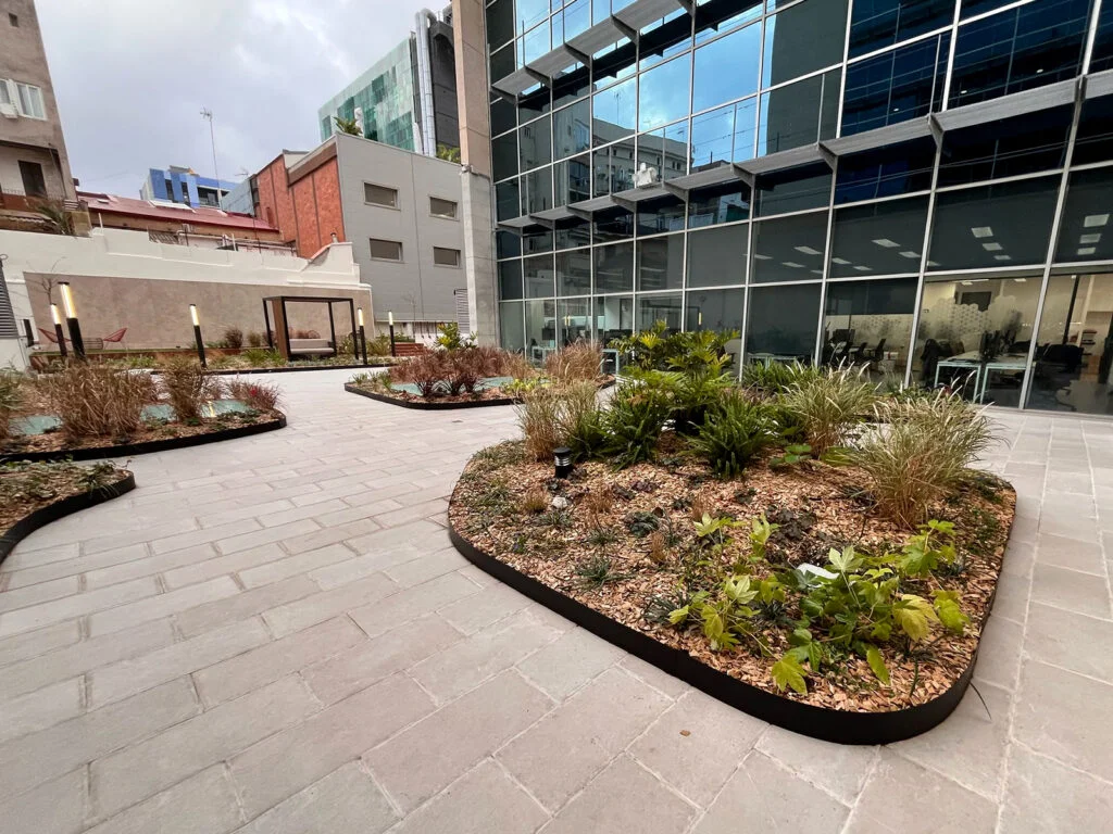 Primer la selecció d’espècies vegetals ha estat clau per assegurar la resiliència del conjunt, prioritzant varietats adaptades al clima mediterrani i a condicions d’exposició variables. Aquest plantejament no només redueix la demanda hídrica, sinó que també afavoreix la biodiversitat i aporta valor ecològic a l’espai.
