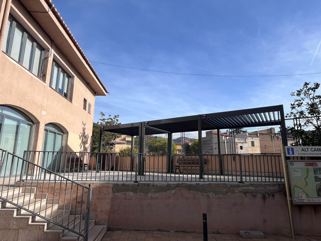 Un dels elements més destacats del projecte és la instal·lació d’una nova pèrgola bioclimàtica a l’esplanada superior de la Casa Creus. Aquesta estructura permet aprofitar l’espai durant tot l’any, gràcies a la seva capacitat de regular la llum i proporcionar ombra natural. Esdevindrà un punt de trobada ideal per a activitats culturals, reunions i moments de descans.